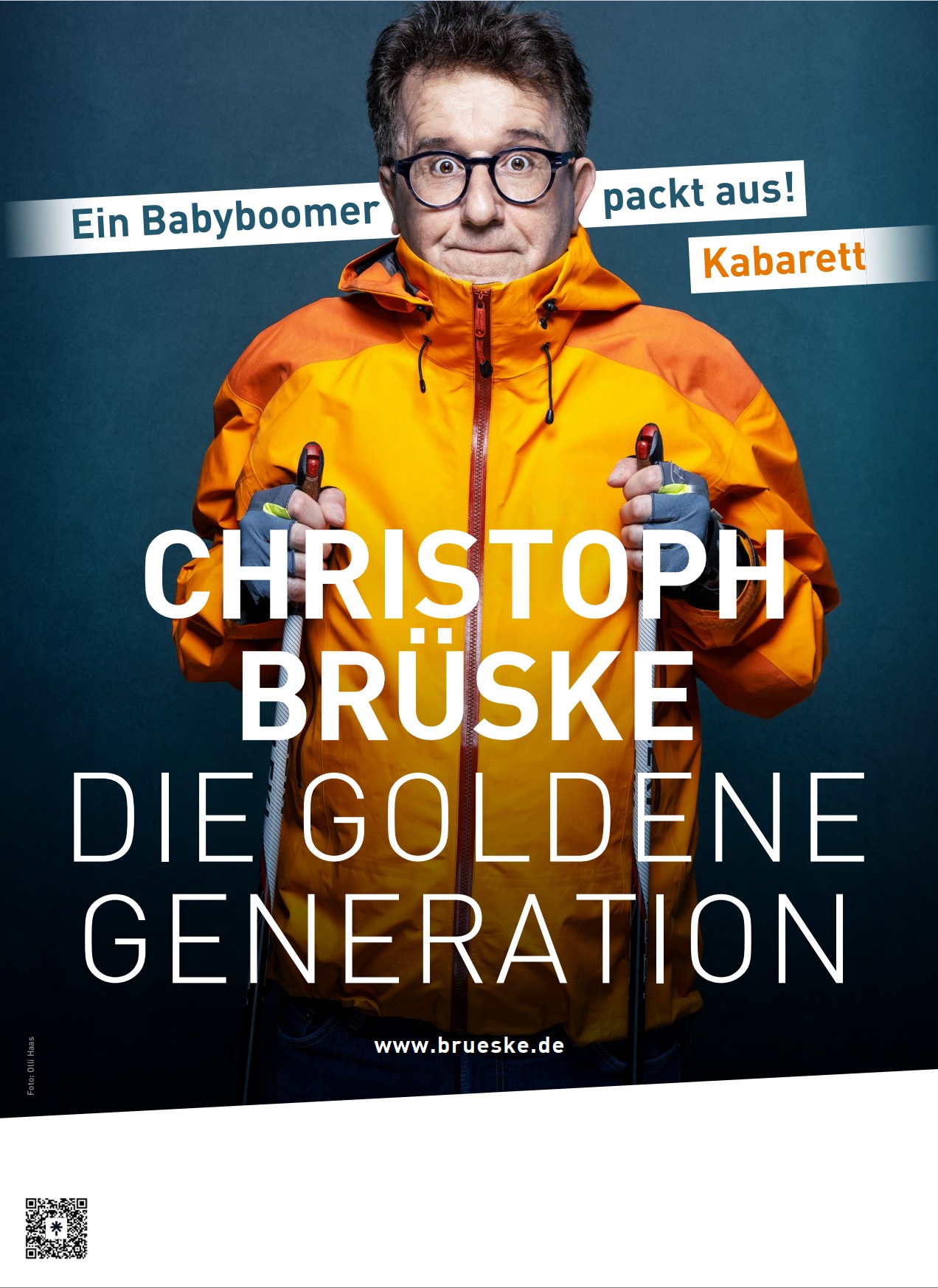 Bevor die Babyboomer einpacken, muss einer mal auspacken: über seine Artgenossen, eine Gesellschaft im Wandel und die Möglichkeiten sich trotz allem das Leben schön zu machen. Wer wäre dafür besser geeignet als der „Verbaltaifun aus dem Rheinland“ Christoph Brüske. Mit viel Charme, wahnsinnigem Wortwitz und mitreißenden Liedern weist der jung gebliebene Endfünfziger den Weg zur „Goldenen Generation“. Und da bleibt kein Auge und kein Nässeschutz trocken. Ein Muss für Kabarettfans jeglichen Alters!
